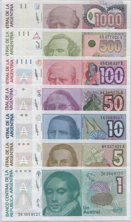 【未使用】【アルゼンチン】7枚セット 1 5 10 50 100 500 1000オーストラリス,1990年